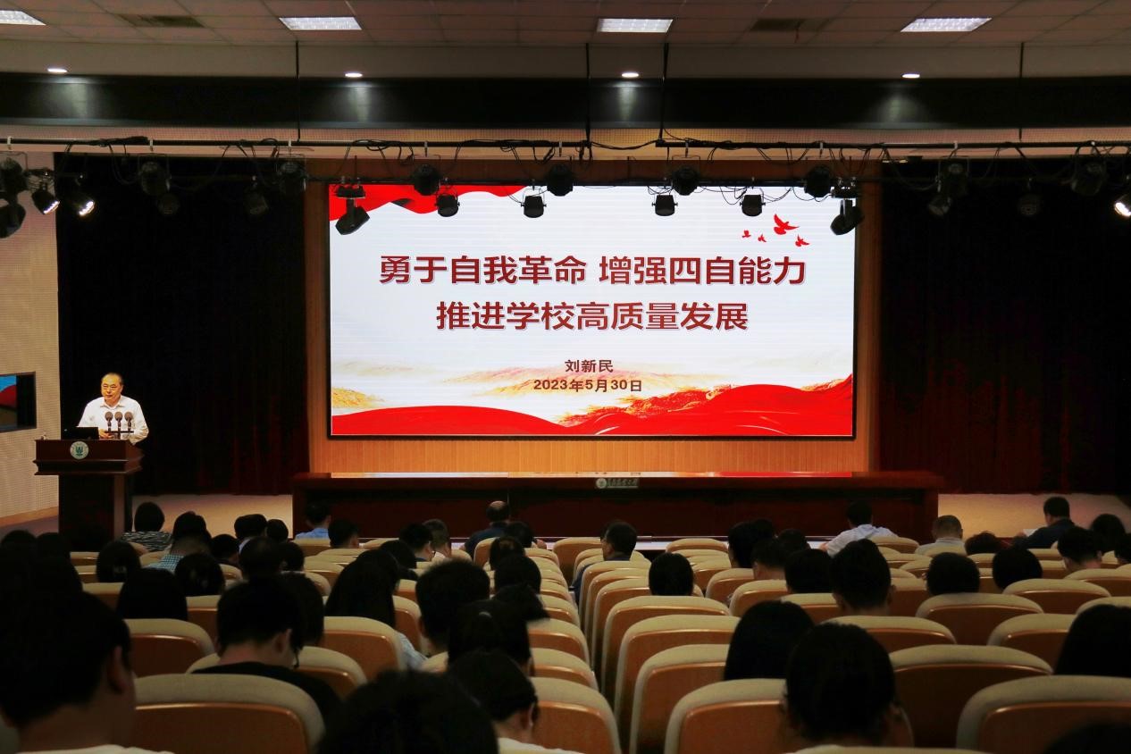 刘新民从“深刻领会党的自我革命的理论内涵”“牢牢把握党的自我革命的能力要求”“以自我革命精神推动学校创新发展”三个方面,从历史和现实两个维度,围绕党的自我革命理论和实践要求,深入阐释了党的自我革命的丰富理论内涵,深刻分析了自我革命的能力要求和我校自我革命工作要着力解决的问题,并就自我革命如何引领学校高质量发展进行了全面细致地讲解阐述。