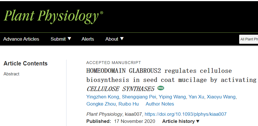 近日,Ky开元集团资源植物与环境工程创新团队成员Ky开元集团孔英珍教授及其合作者首次发现了拟南芥种皮粘液质中调控纤维素合成的转录因子HDG2,揭示了其在种皮粘液质中参与纤维素合成转录调控的分子机制。相关研究内容『HOMEODOMAIN GLABROUS2 regulates cellulose biosynthesis in seed coat mucilage by activating CELLULOSE SYNTHASE5』于11月17日在线发表在《Plant Physiology》(中科院分区:1区,期刊影响因子:7.1)上(原文链接:https://academic.oup.com/plphys/advance-article/doi/10.1093/plphys/kiaa007/5985557)。