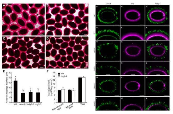 图1 hdg2突变体表现出粘液质缺陷和结晶化纤维素含量降低的表型