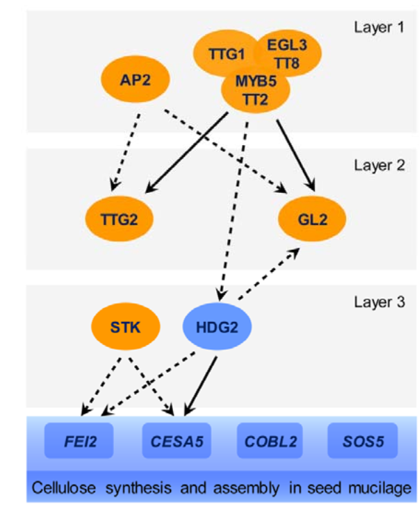 该研究通过原位杂交、酵母单杂、HPLC单糖分析、免疫组化等一系列的生理生化实验证实HD-ZIP IV亚家族的转录因子HDG2通过结合启动子中的L1-box顺式作用元件直接激活纤维素合酶5基因 (CESA5)的表达,首次揭示了转录因子HDG2通过正向调控纤维素合酶CESA5基因表达,进而调控粘液质中纤维素合成的转录调控机制,并提出了一个调控纤维素合成的多层转录调控模型:位于第一层的转录调控因子是AP2和MBW复合体,位于第二层的转录调控因子是TTG2和GL2,HDG2则位于第三层,它直接促进纤维素合酶CESA5和功能蛋白Fei2的表达,进而参与调控纤维素的合成和组装,该研究为揭示纤维素合成的转录调控网络奠定了重要基础。