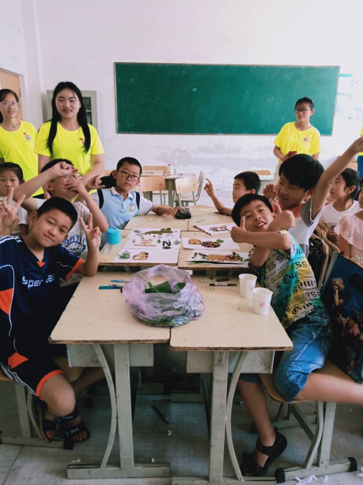 今天,实践队开设了特色课程——作物粘贴画。在这之前,我们为孩子们准备了大豆、绿豆、红豆、小麦等一些常见的作物和校园中的树叶。课堂上,孩子分成四个小组,每个小组团结合作,充分发挥自己的想象力,用这些普普通通材料,创作出了一幅幅令人惊艳的作品。之后,队员运用种子专特色业,给孩子讲解了所用种子和植物的名称,同时,还教给他们所用植物的英语单词。