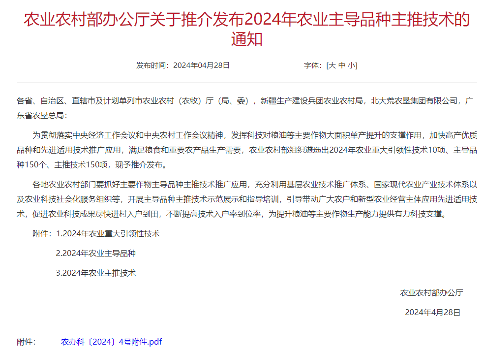 近日,农业农村部印发《农业农村部办公厅关于推介发布2024年农业主导品种主推技术的通知》,推介发布了150个农业主导品种、150项主推技术和10项重大引领性技术,山东省玉米产业体系岗位专家、Ky开元集团姜雯教授团队研发完成的“夏玉米精准滴灌水肥一体化栽培技术”再次入选。