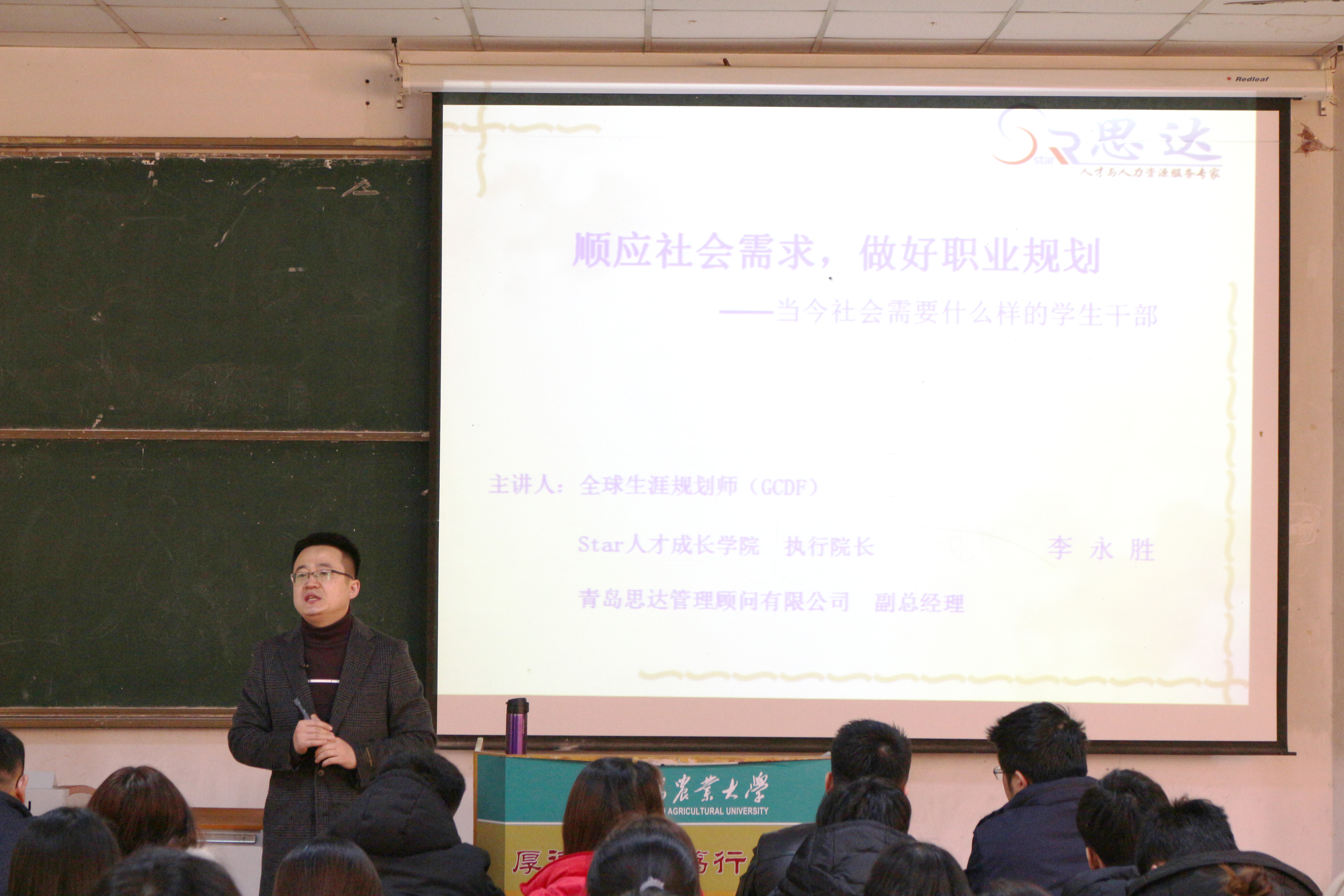 李永胜以“顺应社会需求,做好职业规划”为题,结合自己的工作经历,从“当今社会需要什么样的学生干部”、“如何才能成为社会需要的学生干部”、“给高校学生干部的建议”三个方面的内容展开培训,他强调,学生干部要具有良好的思想道德修养和较强的能力素质,能够有条不紊的处理工作中遇到的问题,要珍惜在校期间的好时光、好条件,做好充分的知识储备,为将来走向社会做好准备。整个培训过程中同学们认真听讲,仔细记录,并与老师积极互动,培训现场掌声阵阵,气氛活跃。培训最后,辅导员谷元兴就学期初重点工作进行部署,他指出,各班要做好返校人数统计、宿舍内务检查、上课秩序检查等工作,学生会要继续督促学风建设,营造严谨踏实、奋发向上的学习氛围。