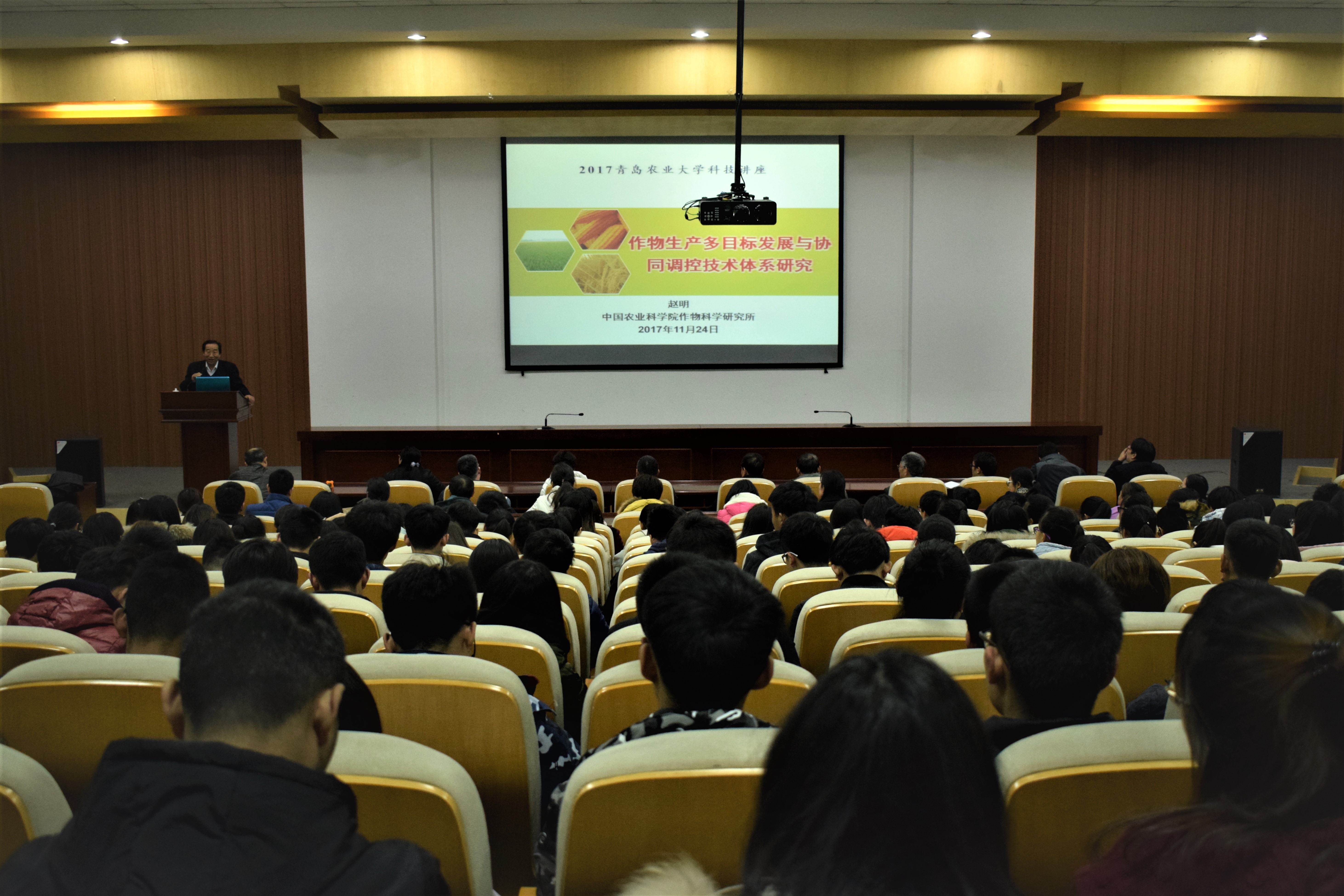 报告会开始,刘庆昌介绍主讲人基本情况并希望全体师生珍惜机会,认真听讲,积极领会。随后,赵明作了题为“作物生产多目标发展与协同调控技术体系研究”的学术报告,他从作物生产科学到世界性科技战略;从多目标技术战略到协同调控体系构建都做了详细报告。整场报告由世界性作物科学的大方向大目标到体系构建,由浅入深,由宏观到微观,层层深入,引人入胜。报告进入尾声,赵明对现场老师及同学们提出的问题做了详细解答,并就粮食安全、转基因等问题分享了自己深刻的见解。整场报告会持续三个小时,互动热烈,让大家受益匪浅。