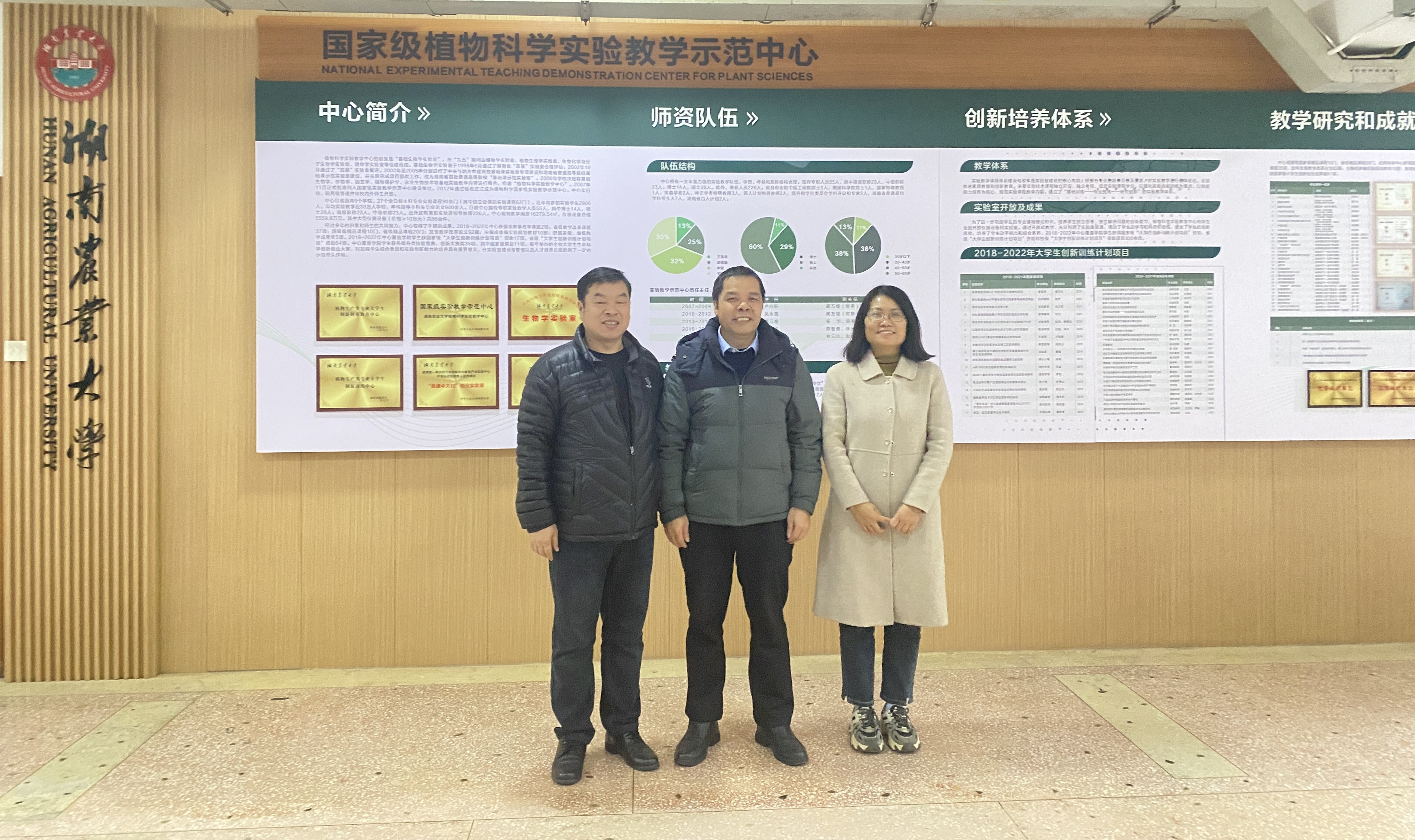湖南农业大学国家级实验教学示范中心主任夏石头、副主任彭晓英带领参观示范中心。夏石头介绍了湖南农业大学植物科学国家级实验教学示范中心发展历程、师资队伍建设、培养体系创新、教学课程研究和已取得的成就等方面的情况。彭晓英对示范中心的运行机制、人才培养、建设思路和经验做法等方面进行详细的说明。双方在如何树立实验教学理念和文化、构建实验教学体系和标准、开发和运用实验教学方式方法、优化仪器设备配置和实验环境等进行了深入交流。