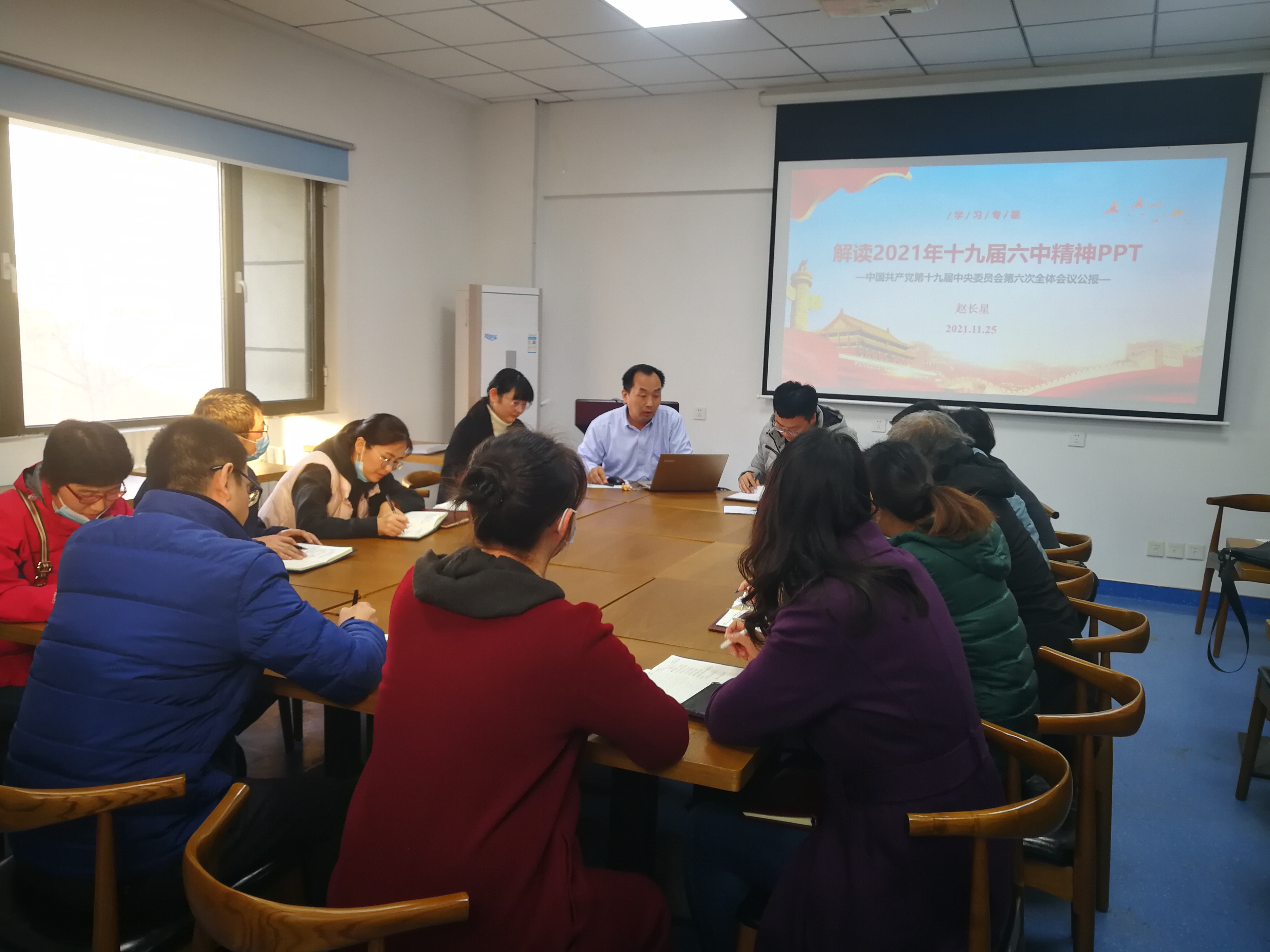 第一党支部书记赵长星以讲党课的形式,带领党员学习了中国共产党第十九届中央委员会第六次全体会议公报。他指出,党的十九届六中全会是在中国共产党成立100周年、全面建设社会主义现代化国家新征程开启之年,召开的一次重要会议,对推动全党统一思想、统一意志、统一行动,团结带领全国各族人民以史为鉴、开创未来,埋头苦干、砥砺前行,在新时代更好坚持和发展中国特色社会主义、实现中华民族伟大复兴具有现实意义和深远历史意义。随后,支部党员结合自身工作实际和学校、学院的发展展开讨论。