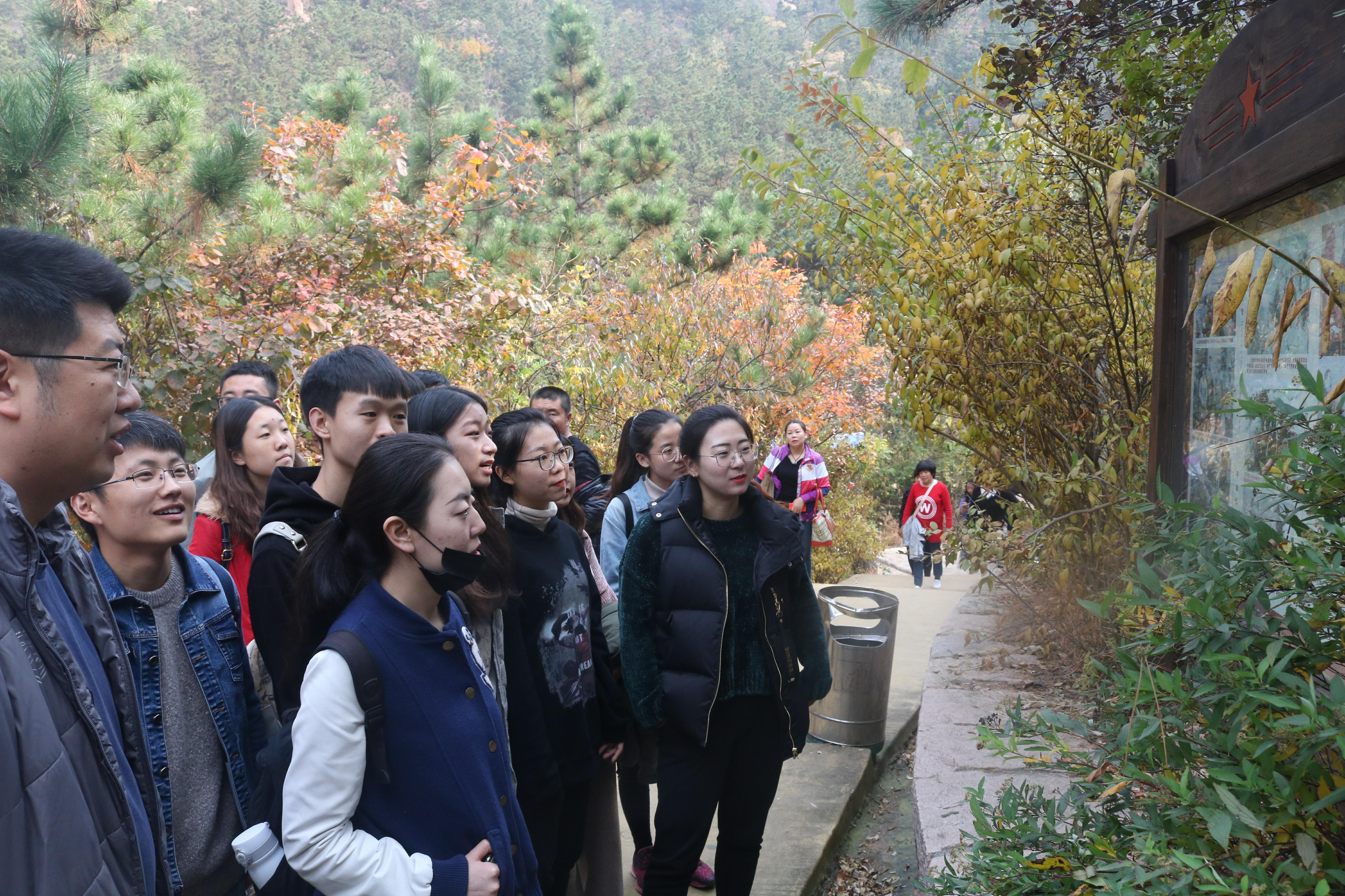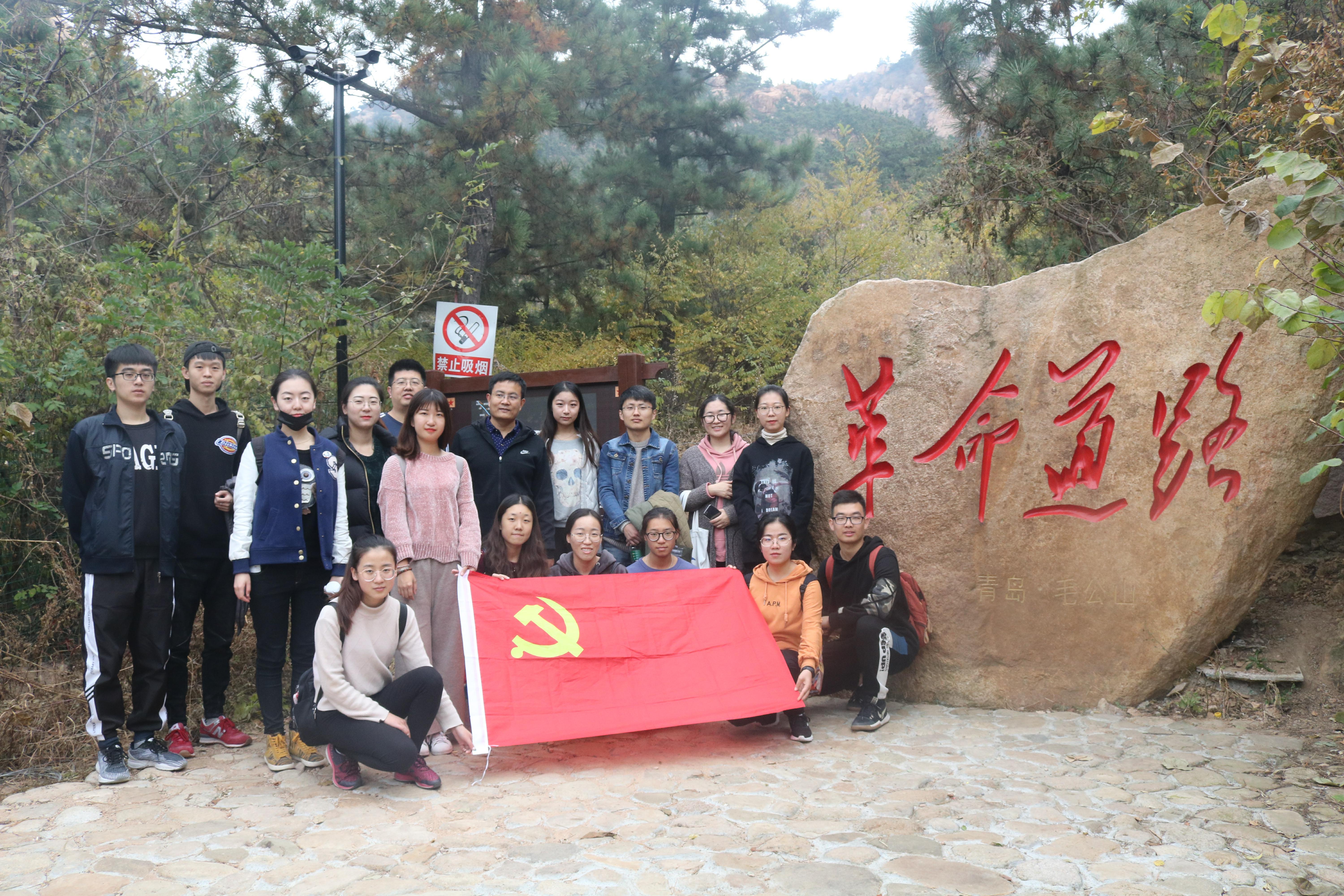 毛公山景区位于青岛市城阳区惜福镇,因一个天然形成的身着中山装的毛泽东站立石像而闻名。登山过程中,姜涛带领学生党员仔细观看山上的文字,从毛泽东少年的凌云壮志、到参加指挥革命的从容不迫,再到新中国成立后旧体制改造的大局意识,同学们的敬畏之心油然而生。大家结合日常所学,认真学习毛泽东同志的生平事迹,重温老一辈革命家走过的革命道路,了解伟人传奇的一生,回顾解放青岛的历史故事。姜涛告诫大家,要谨记和平安定生活的来之不易,深刻感受先辈为革命抛头颅洒热血的崇高品质。最后,一行人在“革命道路”石刻前合影留念。